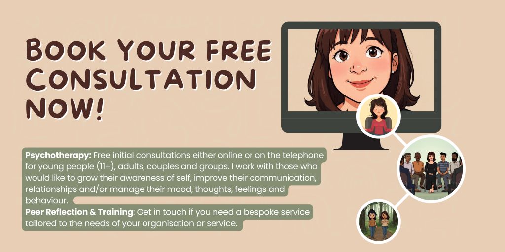 Maybe you’re interested in starting your personal therapeutic journey with me? I am a qualified Psychotherapist and on an Accredited Register (NCPS) that has been accredited by the Professional Standards Authority (PSA). I offer free initial consultations either online or on the telephone for young people, adults, couples and groups. Please use this link to Contact me.